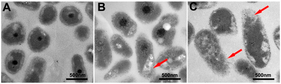 TEM images of R. solanacearum cells after incubation with: sterile water (A); resveratrol (B); and coumarin (C) for 2 h with final concentration 128 μg/mL.