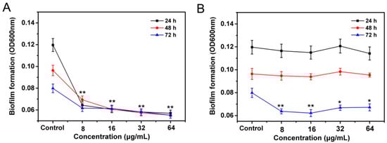 Further, we used a microplate reader to measure the optical density value at 490 nm (OD490) of bacterial biofilms to assess the effects of resveratrol and coumarin on the biofilm-forming ability of R. solanacearum. Bacterial biofilms are a form of bacterial growth on solid surfaces that corresponds to the migratory form of the cells [32]. For most plant pathogens, biofilms constitute a major part of several plant–bacterium interactions, and are involved in locating and infecting host plant roots [33,34]. The current results showed that under the experimental conditions, R. solanacearum exhibited the highest biofilm-forming ability at 24 h of incubation, with an OD490 of 0.120. Biofilm-forming ability gradually decreased with increasing time of incubation, with OD490 = 0.096 and 0.080 after 48 and 72 h, respectively. It is worth noting that treatment concentration plays an important effector role in this interaction process. Differently, the biofilm formation of R. solanacearum was sharply repressed in the presence of resveratrol, even at the low concentration of 8 μg/mL, with the minimum OD490 value of 0.057 after incubation for 24 h (Figure 6A).However, Coumarin had nearly no inhibitory effects on biofilm formation at 24 or 48 h of incubation (Figure 6B), while showed a slight inhibitory effect on biofilm formation of R. solanacearum at 72 h.