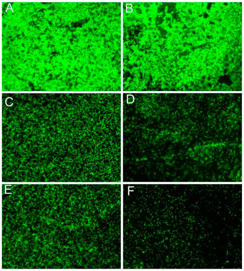 The biofilm inhibitory effects activity of phytochemical against phytopathogens was further substantiated using fluorescent imaging. Fluorescein isothio-cyanate-conjugated concanavalin A (FITC-ConA) dye was used to examine the effects of the two phytochemicals on biofilm formation by R. solanacearum. FITC-ConA can stain extracellular polysaccharides, which is the major component of bacterial biofilms, and emits green fluorescence [35]. The results demonstrated that in the absence of both phytochemical (control group), R. solanacearum biofilm adhered to the carrier in large pieces and formed aggregates of flocculent green fluorescent material (Figure 7A,B). With coumarin (Figure 7C,D) and resveratrol (Figure 7E,F) treatment at 64 μg/mL, only a few bacterial cells adhered to the carrier in a dispersed pattern; the green fluorescent material was markedly reduced and thinned compared with the control. At a higher phytochemical concentration (128 μg/mL), it seems that the number of adherent bacterial cells was reduced even further, while green fluorescent material clustered and overlapped, with enhanced fluorescence. These results further demonstrated that both resveratrol and coumarin inhibited the formation of bacterial biofilms, in agreement with the OD490 measurements.