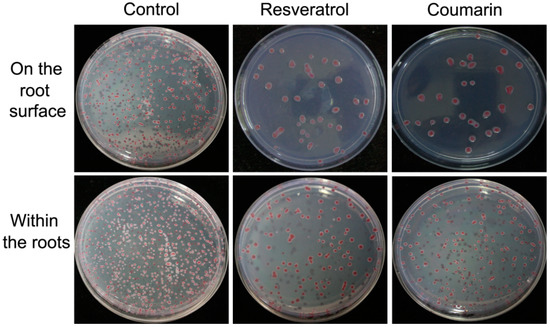 The stock solutions of resveratrol and coumarin (20 mg/mL) were diluted to 128 μg/mL with sterile water. Then, 30 mL of diluted phytochemical solution were respectively evenly irrigated into tobacco roots. Twelve hours later, R. solanacearum cells were inoculated via non-injured root inoculation at OD600 = 0.1 (≈108 cfu/mL), 10 mL per plant. The inoculated tobacco seedlings were cultivated in a plant growth chamber at a temperature of 30 ± 1 °C, relative humidity of 85%–90%, and light period of 14 h. Control plants were irrigated with sterile water in the experiment. Each treatment was designed nine plants and three replicates. One day after inoculation, three plants, which were randomly selected from each treatment, were washed to obtain clean and intact roots. The root weights were recorded. The weighed tobacco roots were placed in a flask containing 50 mL of sterile water and incubated for 30 min at 30 °C, with shaking at 180 r/m. The roots were then rinsed with sterile water and thoroughly mixed with sterile water in the flask. The mixed solution was allowed to stand for 5 min, and 1 mL of tobacco root exterior bacterial suspension was taken from the mid-upper portion with a pipette.