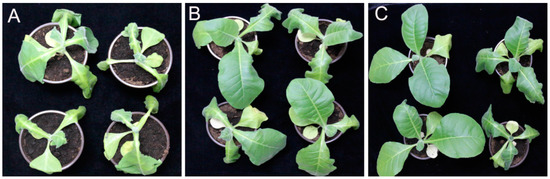 Firstly, the uniformly grown four-week-old tobacco seedlings were selected to carry out the effects of resveratrol and coumarin on tobacco bacterial wilt. Furthermore, 30 mL of diluted phytochemical solution (128 μg/mL) were respectively evenly irrigated into tobacco root soil. Deionized water without phytochemicals or bacteria was set as blank control in this experiment. Nine tobacco seedlings were carried out for each treatment. Twelve hours later, R. solanacearum was inoculated via non-injured root inoculation at OD600 = 0.1 (≈108 cfu/mL) per plant. The inoculated tobacco seedlings were cultivated in a plant growth chamber at a temperature of 30 ± 1 °C, relative humidity of 85%–90%, and light period of 14 h. Following the inoculation of R. solanacearum, the disease occurrence of the tobacco seedlings and disease index were investigated at 7, 9, 13 and 19 days since the first observation of bacterial wilt diseased plants (7 days in our experiment). Bacterial wilt disease classification of tobacco plants in the laboratory was evaluated and recorded according to the “Protocols of Disease Investigation and Classification” [59]. The disease incidence, disease index, and control efficacy were calculated using Equations (2)–(4) as follows: