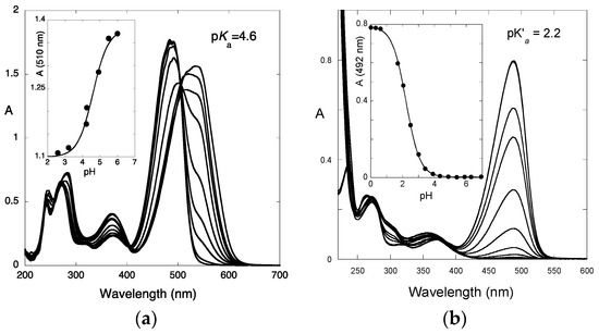 - Basílio, N.; Pina, F. Flavylium network of chemical reactions in confined media: Modulation of 3′,4′,7-trihydroxyflavilium reactions by host-guest interactions with cucurbit[7]uril. ChemPhysChem 2014, 15, 2295–2302. [Google Scholar] [CrossRef] [PubMed]