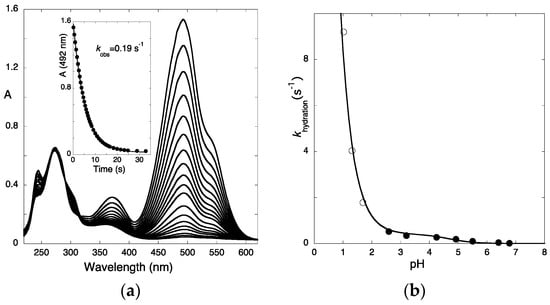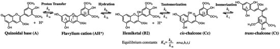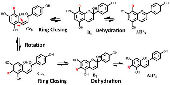 - McClelland, R.A.; Gedge, S. Hydration of the flavylium ion. J. Am. Chem. Soc. 1980, 102, 5838–5848. [Google Scholar] [CrossRef]