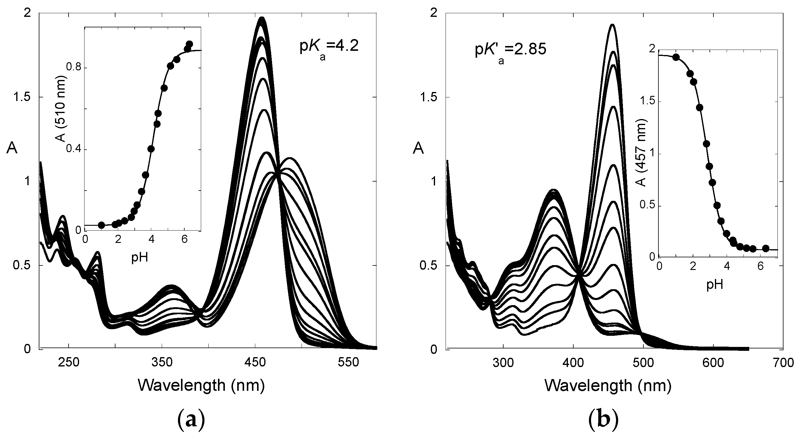 The equilibrium between AH+ and A, Equation (1), is illustrated for the compound shown in Scheme 4 and Figure 1a. The absorption spectra were taken immediately after the pH jump before significant disappearance of AH+/A.