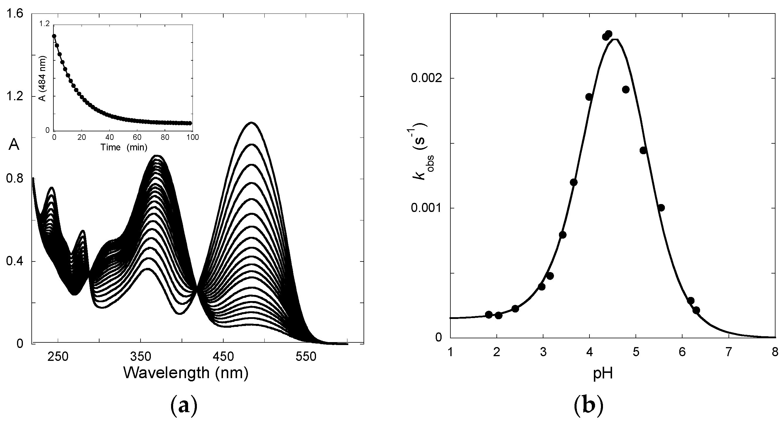 (a) Spectral variations after a direct pH jump 1–5.5; kobs = 1 × 10−3 s−1; (b) Representation of the pH dependent rate constants of the kinetic process to reach the equilibrium after a direct pH jump. Fitting was achieved by means of Equation (12) for the parameters reported in Table 1.