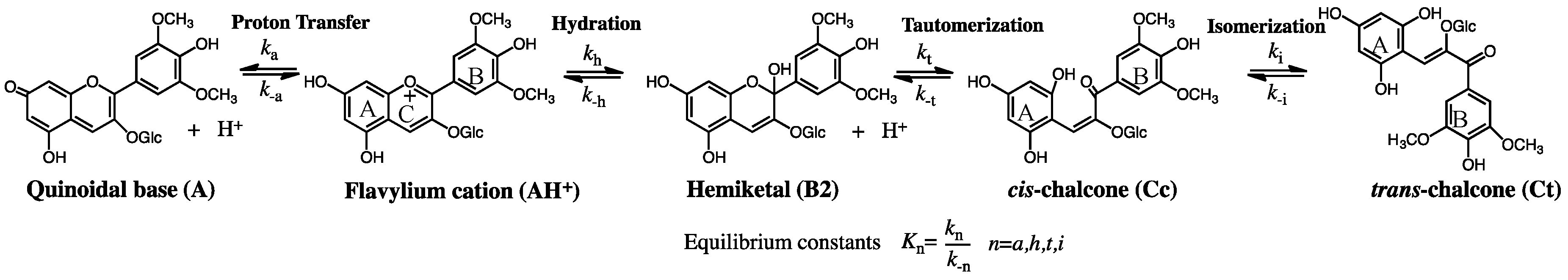 The following set of equations account for the different equilibria in which anthocyanins and related compounds are involved [9].