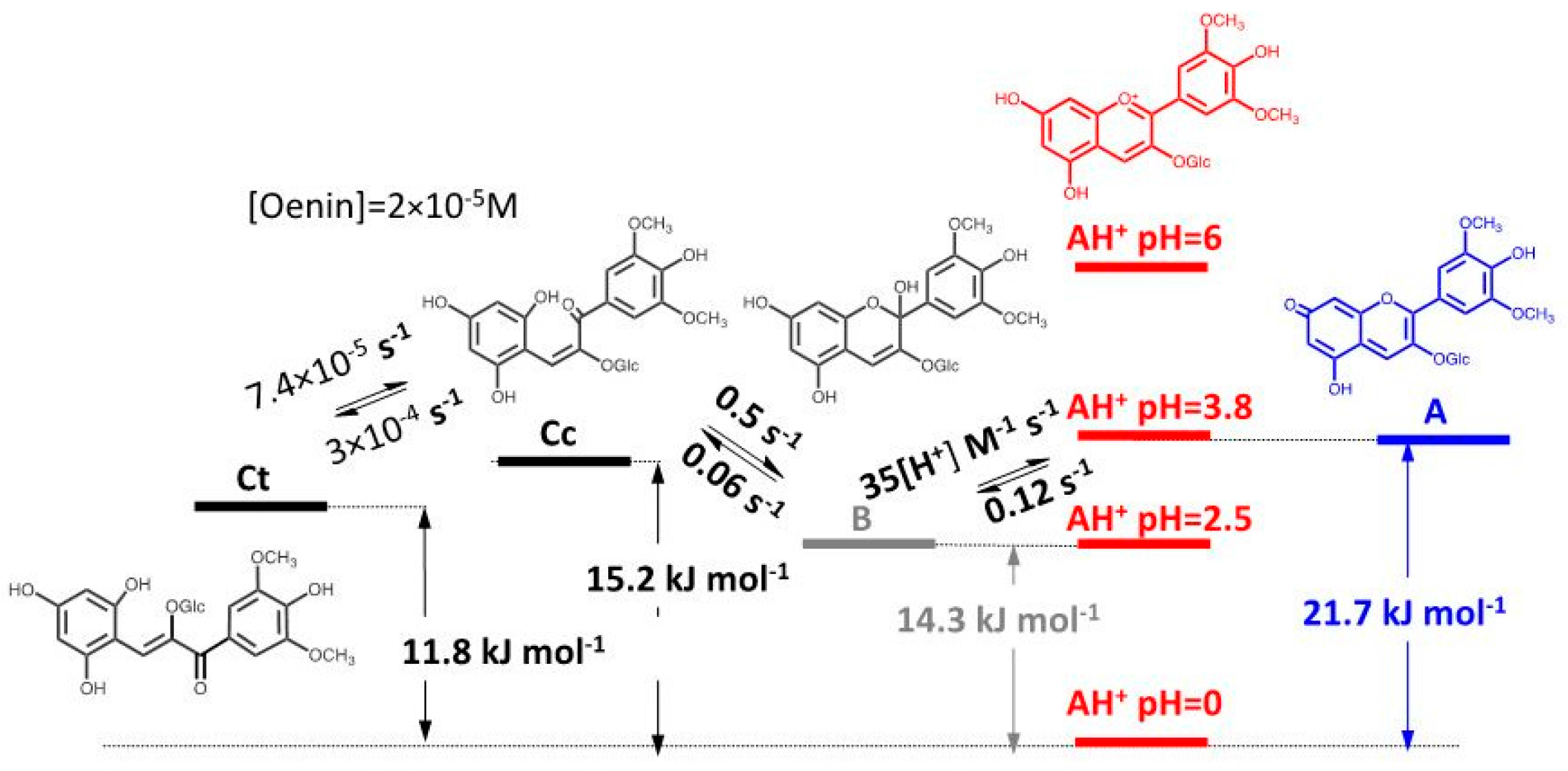 A very useful way to rationalize the chemistry of anthocyanins and related compounds is the construction of an energy level diagram as the one shown in Scheme 2 for malvidin-3-glucoside (oenin). The energy level diagram is easy to construct provided that the equilibrium constants of the four chemical reactions have been previously calculated, see Appendix A [9]. According to Scheme 2, AH+ is the stable species at lower pH values. After a direct pH jump, for example to pH = 3.8, half of AH+ and A are formed and remain in this fraction during the successive kinetic steps. However, B is at this pH value the most stable species and the system evolves to give B in fast equilibrium with the minor species Cc. Due to the fact that anthocyanins exhibit a high cis-trans isomerization barrier, at this point of the kinetics, a pseudo-equilibrium can be considered, a transient sate involving all species except Ct. The system reaches the equilibrium by formation of a small fraction of Ct, a process that takes a few hours.