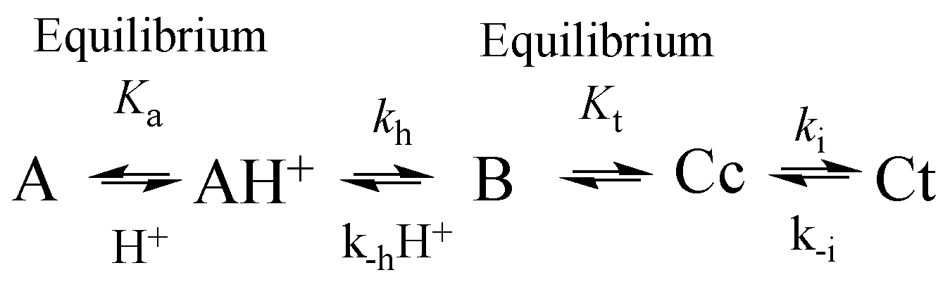 The kinetic processes following a direct pH jump (for the multistate systems exhibiting high cis-trans isomerization barrier as anthocyanins) are summarized in Equations (9)–(11) [10].