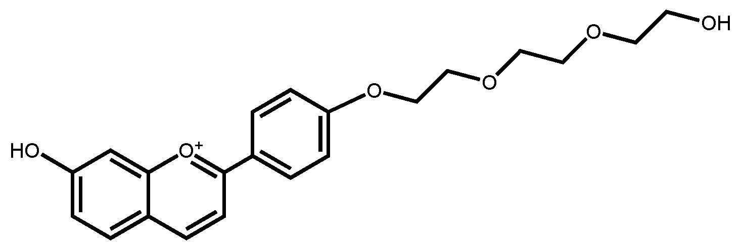 A solution of 1-(4-[2-(2-(2-hydroxyethoxy)ethoxy)ethoxy]phenyl)ethanone (268 mg, 1 mmol) with one equivalent of 2,4-dihydroxybenzaldehyde (138 mg) in a mixture of glacial acetic acid/concentrated sulfuric acid (2 mL:0.5 mL) was stirred overnight at room temperature. Ethyl acetate was added to the red solution and a precipitate was formed. This precipitate was dissolved in methanol acidified with HCl and precipitated with diethyl ether. The dark orange solid was filtered, washed several times with diethyl ether and dried under vacuum. Yield: 120 mg, 28%. 1H-NMR (400 MHz, Methanol-d4 + DCl) δ 9.1597 (d, J = 8.7 Hz, 1H), 8.5104 (d, J = 8.7 Hz, 2H), 8.4002 (d, J = 8.7 Hz, 1H), 8.2044 (d, J = 8.9 Hz, 1H), 7.5690 (br, 1H), 7.4588 (dd, J = 8.9, 2.1 Hz, 1H), 7.3141 (d, J = 8.7 Hz, 2H), 4.3823 (t, J = 4.4 Hz, 2H), 3.9484 (t, J = 4.4 Hz, 2H), 3.7920–3.7343 (m, 2H), 3.7220–3.6604 (m, 6H), 3.5966 (t, J = 4.8 Hz, 2H). 13C-NMR (101 MHz, Methanol-d4 + DCl) δ 173.43, 170.60, 167.71, 160.56, 155.06, 134.09, 133.48, 122.72, 120.44, 117.59, 113.63, 103.72, 73.66, 71.82, 71.44, 70.45, 69.69, 62.20. Elemental analysis (%) calcd for C21H23O6. Cl. 1.5H2O (Mr = 433.88): C 58.13, H 6.04; Found: C 58.34, H 5.48.