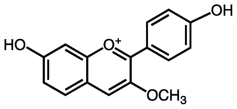 - Brouillard, R.; Delaporte, B. Chemistry of anthocyanin pigments. 2. Kinetic and thermodynamic study of proton transfer, hydration, and tautomeric reactions of malvidin 3-glucoside. J. Am. Chem. Soc. 1977, 99, 8461–8468. [Google Scholar] [CrossRef]