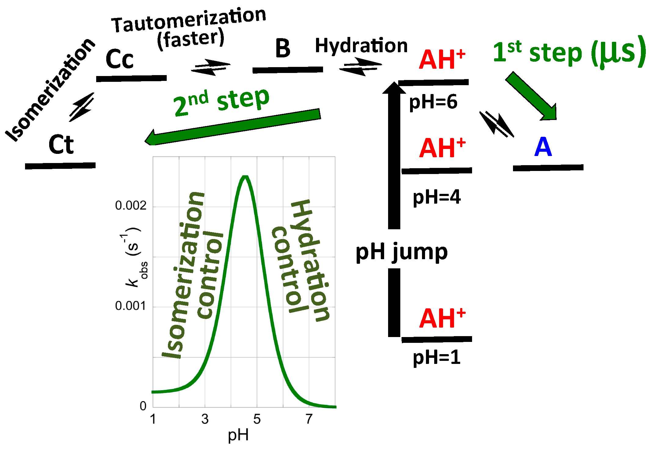 Energy level diagram of a system possessing high cis-trans isomerization barrier. During the mixing time, an equilibrium between AH+ and A is established. The second step (green) is controlled by the hydration reaction, and the third and slower (blue) by the isomerization.