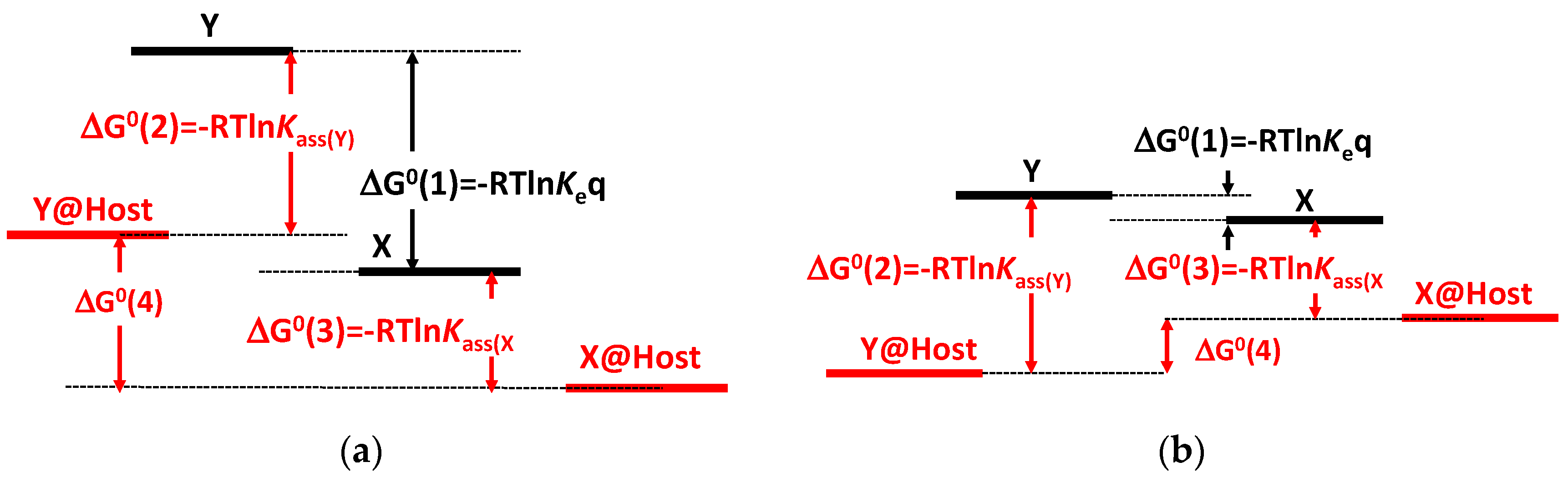 A global fitting of Equations (14) and (16), Figure 3b together with the data from Table 1 allow calculating all the equilibrium (Table 2) and rate (Table 3) constants of the multistate and drawing the respective energy level diagram, Scheme 6.