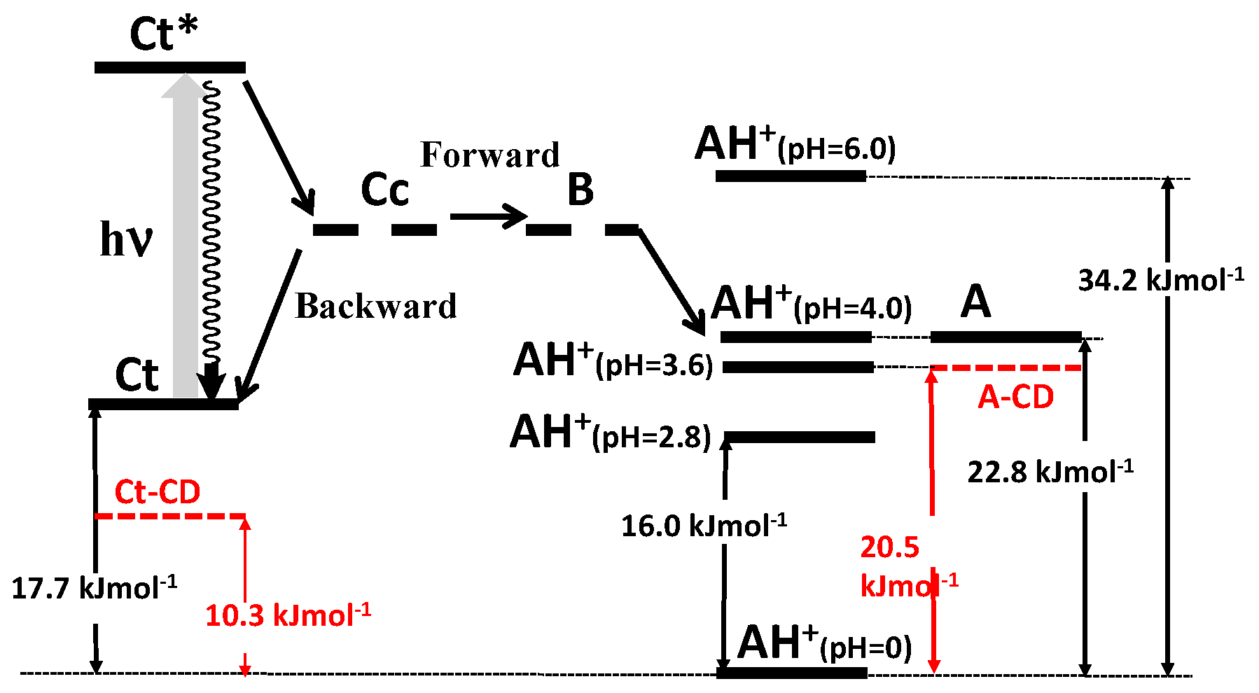 Energy level diagram of 4′,7-dihydroxyflavylium in the absence (black color) and presence of β-cyclodextrin 9 mM (red color). With permission of ACS from reference [29].