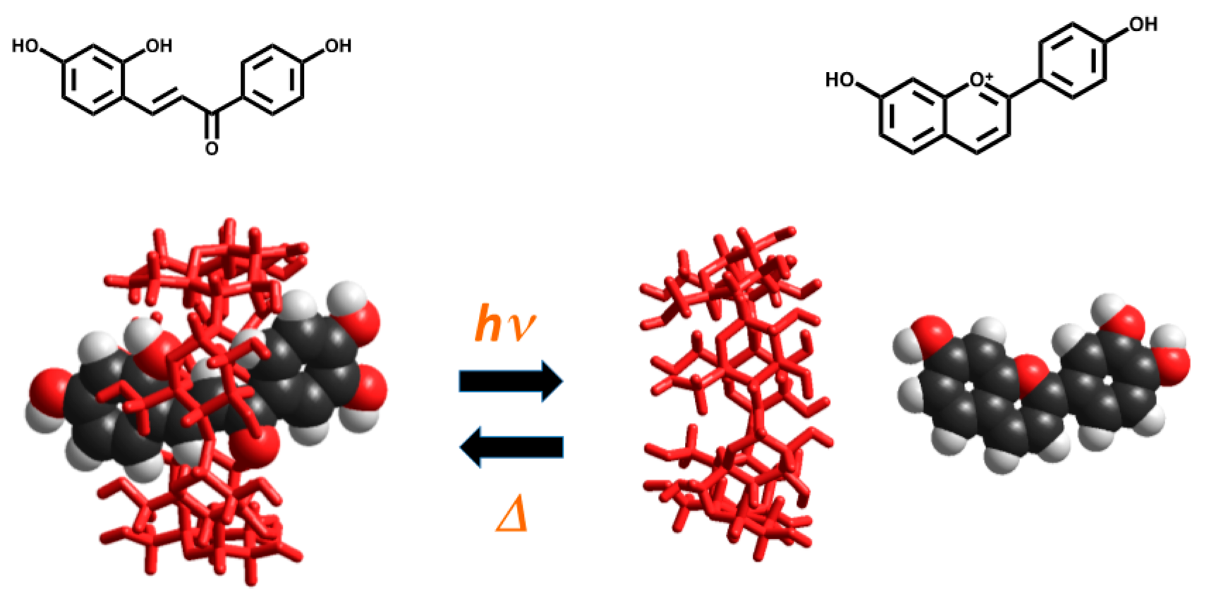 Irradiation of the trans-chalcone inside the host leads to the flavylium cation that does not interact and is removed from the cavity (Scheme 16). The system is reversible and defines a photochromic system showing great potential to be applied in the fields of photo-responsive host–guest complexes and self-assembled soft materials.