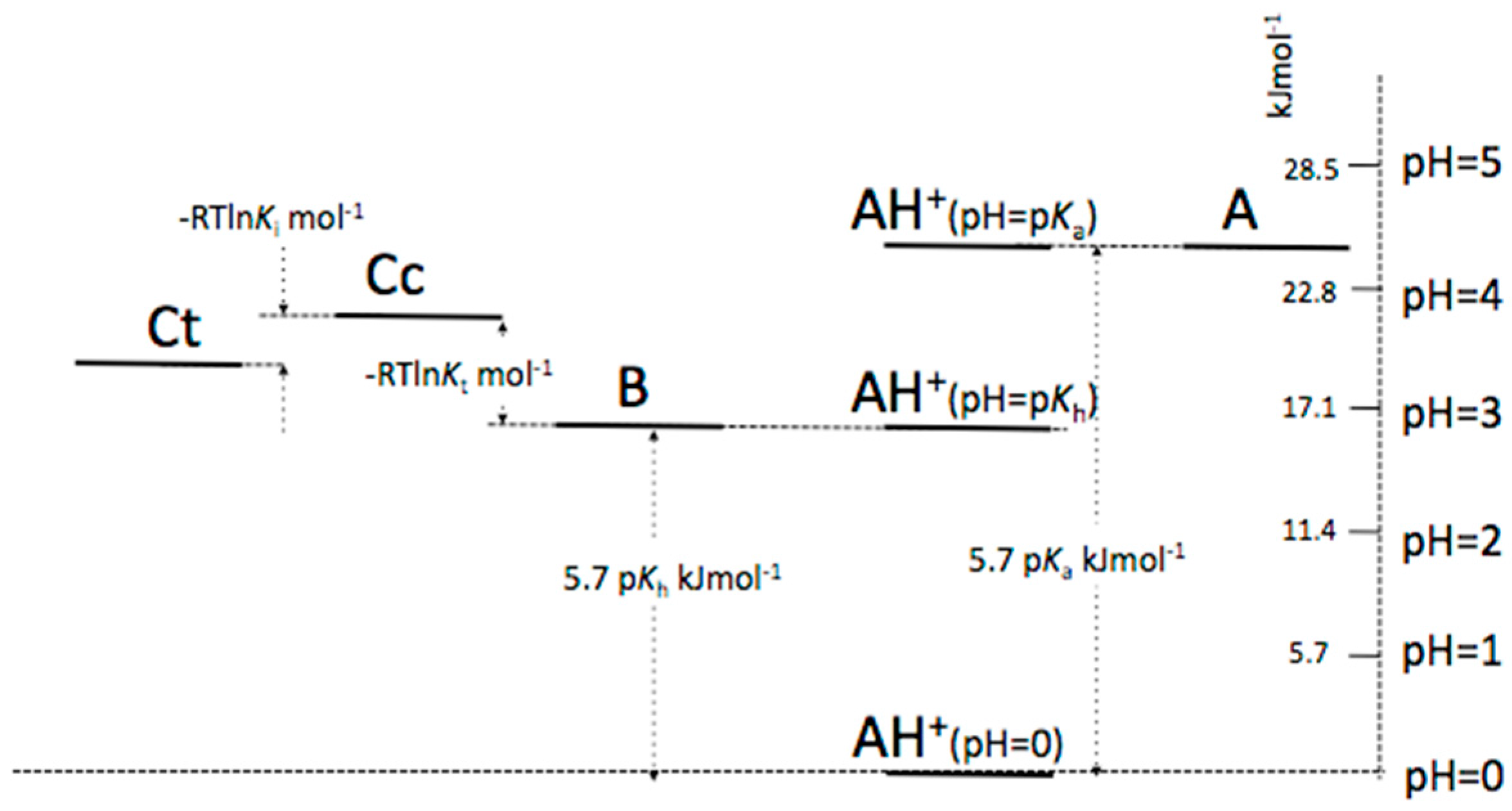 According to Equation (A5), it is possible to calculate ΔG° for each pH value. In particular, if pH is one unit higher than pKa, ΔG° increases by 5.7 kJ·mol−1 and one unit lower decreased by the same amount, Scheme A5.