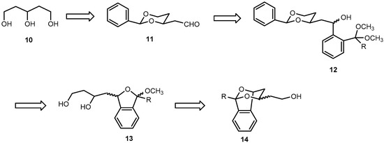 The plan for the synthesis of tricyclic compounds 14 is based on two subsequent intramolecular transacetalization reactions. At first, aldehyde 11 will be prepared by acetalization of pentane-1,3,5-triol (10) with benzaldehyde and subsequent oxidation of the primary alcohol. Reaction of 11 with an arylmetal derivative bearing an acetalic substituent in the o-position will provide the secondary alcohols 12 (Scheme 1). Starting from 12, the first intramolecular transacetalization will establish the benzofuran ring, and the second intramolecular transacetalization after cleavage of the 1,3-dioxane ring (13) will afford the tricyclic system 14.
