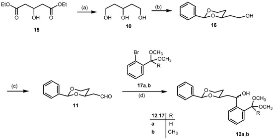 Treatment of aryl bromides 17a,b [17,18] with n-butyllithium at −78 °C led to the corresponding aryllithium intermediates, which reacted with the aldehyde 11 to give the secondary alcohols 12a,b. Both alcohols 12a and 12b were isolated as a mixture of two diastereomers in the ratio 2:1. The ratio of diastereomeric alcohols 12a and 12b was determined by integration of characteristic methyne signals (PhCH(dioxane), R2CHOH, PhCH(OCH3)2) in the 1H-NMR spectra.