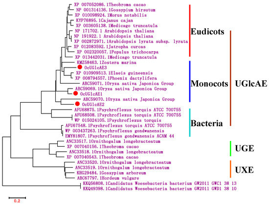 Phylogenetic tree of O. caudatum OcUGlcAE family with other UGlcAEs, UGEs and UXEs from varied organisms. The tree was constructed by MEGA 7.0 using Neighbor-joining method. The reliability of the tree was measured by bootstrap analysis with 1000 replicates. Red circles represent the member of OcUGlcAE family. Branch lengths are shown to scale.