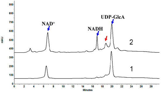 HPLC analyses of the products formed by the supernatant from P. pastoris expressing the empty vector alone (1) or pPIC3.5kOcUGlcAE3 (2) in the presence of UDP-GlcA and NAD+. The newly formed UDP-GalA was marked by a red arrow.