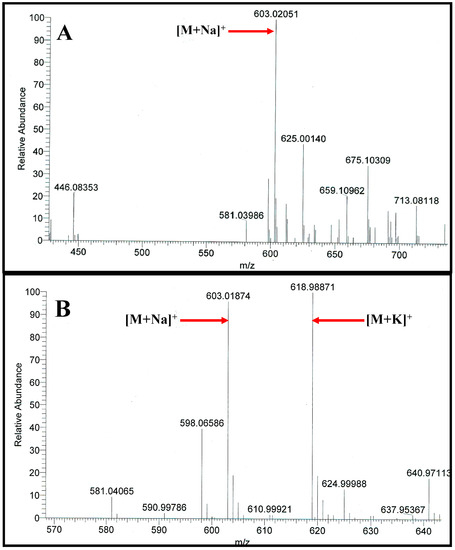 For analysis of enzymatic activity of OcUGlcAEs, the supernatant of three recombinant P. pastoris strains containing pPIC3.5kOcUGlcAEs was used directly as the biocatalyst for the interconversion of UDP-GalA and UDP-GlcA, respectively. The newly formed products were monitored by a HPLC-based assay. When UDP-GlcA and NAD+ were incubated with the supernatant harboring a recombinant OcUGlcAE3 protein, a new peak, having the same retention time and UV spectra as the authentic UDP-GalA, was detected in the HPLC profile (Figure 4). The supernatant of P. pastoris expressing the empty control vector did not yield a new peak, indicating the observed new peak was exclusively produced by the recombinant OcUGlcAE3. To further verify that the newly formed reaction product representing exactly UDP-GalA, the UDP-GalA standard was co-injected with the reaction mixture under the HPLC-based assay. Only a UDP-GalA peak with no shouldering was found by HPLC analysis, suggesting UDP-GalA was produced from 4-epimerization of UDP-GlcA (Figure S4). Finally, to determine the identity of the newly formed product, the enzymatic product eluting from the HPLC column was collected and confirmed by mass spectrometry. The mass spectrometer gave the most abundant ion at m/z 603.01874, corresponding to an adduct of the detected molecule with a sodium atom [M + Na]+. The molecular mass of the epimerized derivative of UDP-GalA catalyzed by OcUGlcA3 was thus inferred to be 580, which was identical to that of UDP-GalA standard (Figure 5A). Taken together, these data unambiguously identified that the newly formed product catalyzed by recombinant OcUGlcA3 proteins was UDP-GalA.