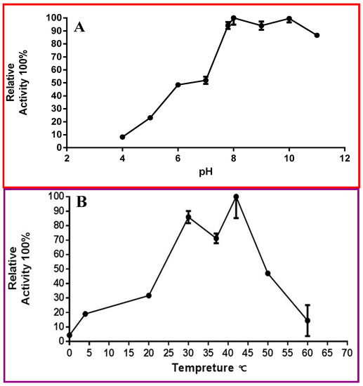 The effect of pH (A) or temperature (B) on the OcUGlcAE3 activity.
