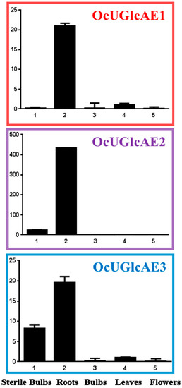 Expression analyses of OcUGlcAEs in varied tissues including roots, bulbs, leaves, flowers and sterile bulbs were performed using RT-qPCR technology described in our recent publications [17,18]. GAPDH (glyceraldehyde-3-phosphate dehydrogenase) was used as an internal control to normalize the expression level of OcUGlcAE genes. The gene-specific primers used for RT-qPCR assay were designed according to Primer Express 3.0 software (Applied Biosystems, Waltham, MA, USA) and summarized in Table S3.