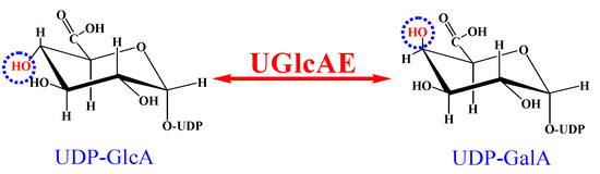 The interconversion of UDP-GlcA and UDP-GalA catalyzed by UglcAEs.