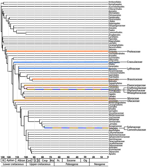 The diversity and similarities of tropane and granatane producing angiosperms. The orders tropane alkaloids belong to are highlighted in orange. The orders granatane alkaloids belong to are highlighted in blue. Shared orders are represented by both colors. The plant families that are known to produce tropane and granatane alkaloids are branched off from the orders. The scale at the bottom represents millions of years. Modification of the phylogenetic tree published in [54], republished with permission with the Botanical Society of America.