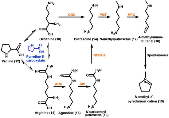 A nonsymmetrical intermediate has been proposed for the production of the pyrrolidine ring, if the amino acid ornithine (10) is first methylated at the γ-N position. A proposed alternative route includes the decarboxylation of ornithine (10) to form the polyamine putrescine (14) as the first step [59,60]. Feeding studies of radioactively labeled ornithine-2-14C have shown that several Datura species incorporate a nonsymmetrical intermediate [59]. However, a symmetrical intermediate has been reported for Nicotiana, Erythroxylum, and Hyoscyamus species [61]. Symmetrical incorporation showed activity at positions C1 and C5 of the tropane ring and has been reported for Nicotiana, E. coca, and Hyoscyamus albus [59,60]. A one-step enzymatic approach is possible to reach a symmetrical intermediate by converting ornithine (10) into putrescine (14) catalyzed by ornithine decarboxylase (ODC) [62]. Another route to putrescine (14) can be taken by starting with the amino acid arginine (11). The decarboxylation of arginine (11) into agmatine (15) is catalyzed by arginine decarboxylase (ADC). Agmatine (15) can then be converted into N-carbamoyl putrescine (16) via agmatine imino hydrolase (AIH). The enzyme N-carbamoyl putrescine amido hydrolase (NCPAH) then yields putrescine (14). Both the ADC and ODC directed pathways have different and diverse outcomes in regards to primary and secondary metabolism. Putrescine (14) that was produced by ODC is important for the supply of polyamines for primary metabolic processes such as cellular differentiation, development and division [63]. On the other hand, putrescine (14) that was produced by ADC in the Solanaceae is thought to be required for environmental stress related responses.