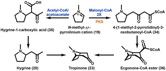 While the biochemical role of PMTs and MPOs are generally accepted steps leading to the first ring closure of tropane intermediates in the Solanaceae, the enzymatic basis of the second ring closure is controversial. For many years, the compound hygrine (20), (R)-1-(1-methylpyrrolidin-2-yl)-propan-2-one was thought to be a direct intermediate based on feeding studies, however more recent studies have demonstrated that previous results are likely experimental artifacts [77,78,79]. In solanaceous plants the best incorporation into the second ring was achieved from racemic ethyl [2,3-13C2]-4-(N-methyl-2-pyrrolidinyl)-3-oxobutanoate [77,80], a polyketide based molecule (Scheme 2). Further evidence for the involvement of a polyketide was demonstrated by the feeding of methyl (RS)-[1,2-13C2,1-14C]-4-(1-methyl-2-pyrrolidinyl)-3-oxobutanoate to the leaves of E. coca [81]. This strongly implicates the involvement of acetate-derived metabolites (e.g., polyketides) during the formation of the second ring in TAs. There are limited types of enzymes capable of catalyzing this type of condensation reaction. In the case of benzylisoquinoline alkaloid biosynthesis a Pictet–Spenglerase enzyme was shown to condense dopamine with 3,4-dihydroxyphenylacetaldehyde [82]. However, based on more recent isotope and radiolabeled feeding studies it is hypothesized that a type III polyketide synthase (PKS) reaction is involved in condensing acetate units onto the N-methyl-Δ1-pyrrolinium cation (19) leading to the second ring closure of TA biosynthesis [77,80,83]. Type III PKSs are a family of enzymes known to catalyze the iterative decarboxylative condensation of malonyl-CoA onto CoA-tethered substrates. Type III PKSs are promiscuous enzymes that have a broad tolerance for diverse substrates and are able to catalyze multiple reactions [84,85]. Type III PKSs that use cyclic nitrogen-containing substrates have been previously characterized for their roles in alkaloid production [86,87,88]. However, unlike these previous studies the predicted substrate in TA metabolism, N-methyl-Δ1-pyrrolinium cation (19) is charged and lacks a CoA thioester.