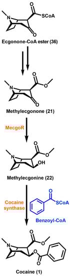 The benzoic ester of methylecgonine (22) is cocaine (1). Methylecgonine (22) is a molecule that has little physiological activity until it is converted into cocaine (1) [95]. There has been a prediction that an acyltransferase in E. coca utilizes benzoyl-CoA as the activated acid. This prediction was based on feeding studies using trans-[3-13C,14C]-cinnamic acid and the N-acetylcysteamine thioester of [3-13C,14C]-trans-cinnamic acid [96]. Methylecgonine (22) undergoes esterification with a benzoyl moiety that was predicted to utilize benzoyl-CoA as the activated acyl donor [97]. It was not determined if it arises from benzoyl-CoA or benzaldehyde, but the moiety was found to be derived from cinnamic acid [96,97]. Acylation reactions of secondary metabolites in plants are catalyzed by several acyltransferase families, however only the BAHD acyltransferase is known to utilize the activated acyl-CoA thioesters [98]. TAs are modified through the esterification of the hydroxyl function at the C3 position in the tropane ring. It has been established that in E. coca, the cocaine synthase reaction uses benzoyl-CoA and methylecgonine (22) as substrates. With the CoA-dependent nature of this enzyme along with the reported properties for the tigloyl-CoA:pseudotropine acyltransferase from D. stramonium, it was hypothesized that cocaine synthase is a member of the BAHD acyltransferase superfamily [99]. This superfamily of enzymes is well known to participate in secondary metabolite modification of esters and amides [98]. Cocaine synthase was found to be capable of producing both cocaine (1) via activated benzoyl-CoA thioester and cinnamoylcocaine via activated cinnamoyl-CoA thioesters [100]. It has been determined that the acylation of the 3β-hydroxyl function of methylecgonine (22), catalyzed by cocaine synthase, forms cocaine (1) and other TAs in E. coca. The accumulation and biosynthesis of TAs in E. coca occur within the same tissue. Cocaine synthase is found localized in the parenchyma and spongy mesophyll of the leaves. These tissues are both responsible for the biosynthesis and storage of TAs in this species. 4-coumaroylquinate has been reported to assist in the storage of cocaine (1) and cinnamoylcocaine in E. coca [101]. This is in contrast to TAs produced in the Solanaceae family where the core biosynthetic pathway is in the roots, while the metabolites accumulate in the aboveground portions of the plants [70].