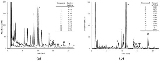 HPLC chromatograms of (a) FRE (fermented rooibos extract) and (b) GRT (unfermented rooibos extract) at 288 and 350 nm (solid and dotted lines, respectively). Content values of compounds are expressed as g/100 g extract (1, PPAG (Z-2-(β-D-glucopyranosyloxy)-3-phenylpropenoic acid), 2, isoorientin; 3, orientin; 4, ASP (aspalathin); 5, quercetin-3-O-robinobioside; 6, vitexin; 7, hyperoside; 8, rutin; 9, isovitexin; 10, isoquercetrin; 11, luteolin-7-O-glucoside, and 12, nothofagin).