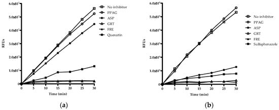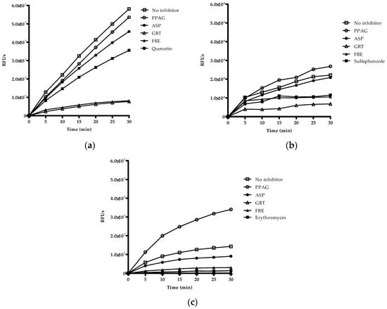 Qualitative screening of extracts and compounds was used to identify potential inhibitory effects on CYP2C8, CYP2C9 and CYP3A4. The organic solvents such as methanol, acetonitrile and DMSO showed no inhibitory effects on the respective enzymes (Supplementary Materials, Figure S1a–c). Quercetin, sulfaphenazole, and ketoconazole were the selected positive inhibitors for CYP2C8, CYP2C9, and CYP3A4, respectively. GRT and FRE inhibited the reaction rate of CYP2C8, CYP2C9, and CYP3A4 as measured over 30 min (Figure 2a–c). ASP showed 24% inhibition of CYP2C9 at 100 µg/mL and 23% inhibition of CYP3A4 at 200 µg/mL activity, while PPAG had no effect on any of these enzymes.
