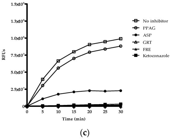 A three-fold serial dilution of PPAG, ASP, GRT, and FRE was added to CYP2C8 and CYP2C9 (concentration range 100–0.41 µg/mL) and CYP3A4 (concentration range 200–0.82 µg/mL) to determine their respective IC50 concentrations. CYP2C8, CYP2C9, or CYP3A4 BACULOSOMES® plus reagent and regeneration system in Vivid® reaction buffer I/II added to a black Costar 96-well plate containing test extracts and compounds were incubated for 15 min at 37 °C. Thereafter, as previously described, the reaction was initiated by adding a mixture of reconstituted DBOMF (CYP2C8) or BOMCC (CYP2C9 and CYP3A4) and NADP+ in Vivid® reaction buffer I/II and incubated for 30 min at 37 °C. After addition of the stop solution to terminate the reaction, fluorescence was determined at the relative excitation/emission wavelengths described in Section 4.5.