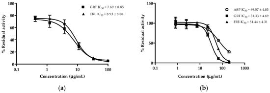 GRT and FRE showed strong inhibition of CYP2C8 activity (7.69 ± 8.85 µg/mL and 8.93 ± 8.88 µg/mL, respectively) (Figure 3a). Both extracts moderately inhibited CYP3A4 activity (31.33 ± 4.69 µg/mL and 51.44 ± 4.31 µg/mL, respectively) (Figure 3b), while ASP displayed weak inhibition of CYP3A4 activity (69.57 ± 4.03 µg/mL) (Figure 3b).