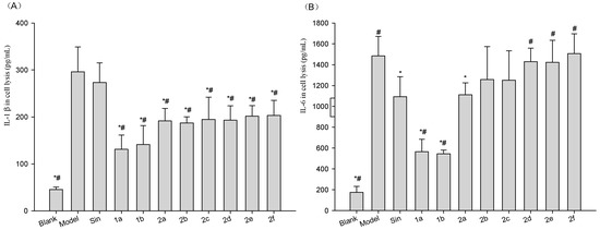 Effect of Sin or 1a–2f on the extracellular secretion of (A) IL1β; (B) IL6, and (C) TNF-α in LPS-treated Raw264.7 cells. Raw264.7 cells were treated with 1 µg/mL of LPS (Blank was untreated), followed by 10 µg/mL Sin or 1a–2f for a total of 12 h. The blank and vehicle (Model) samples were treated with an equivalent volume of arialhicle. Sin did not reduce the LPS-induced increase in IL1β, IL6, or TNF-α, while the 1a–2f derivatives had varying effects on these inflammatory cytokines. Results are expressed as mean ±SD (n = 3). * p < 0.05 vs. vehicle (Model Group); # p < 0.05 vs. Sin Group.