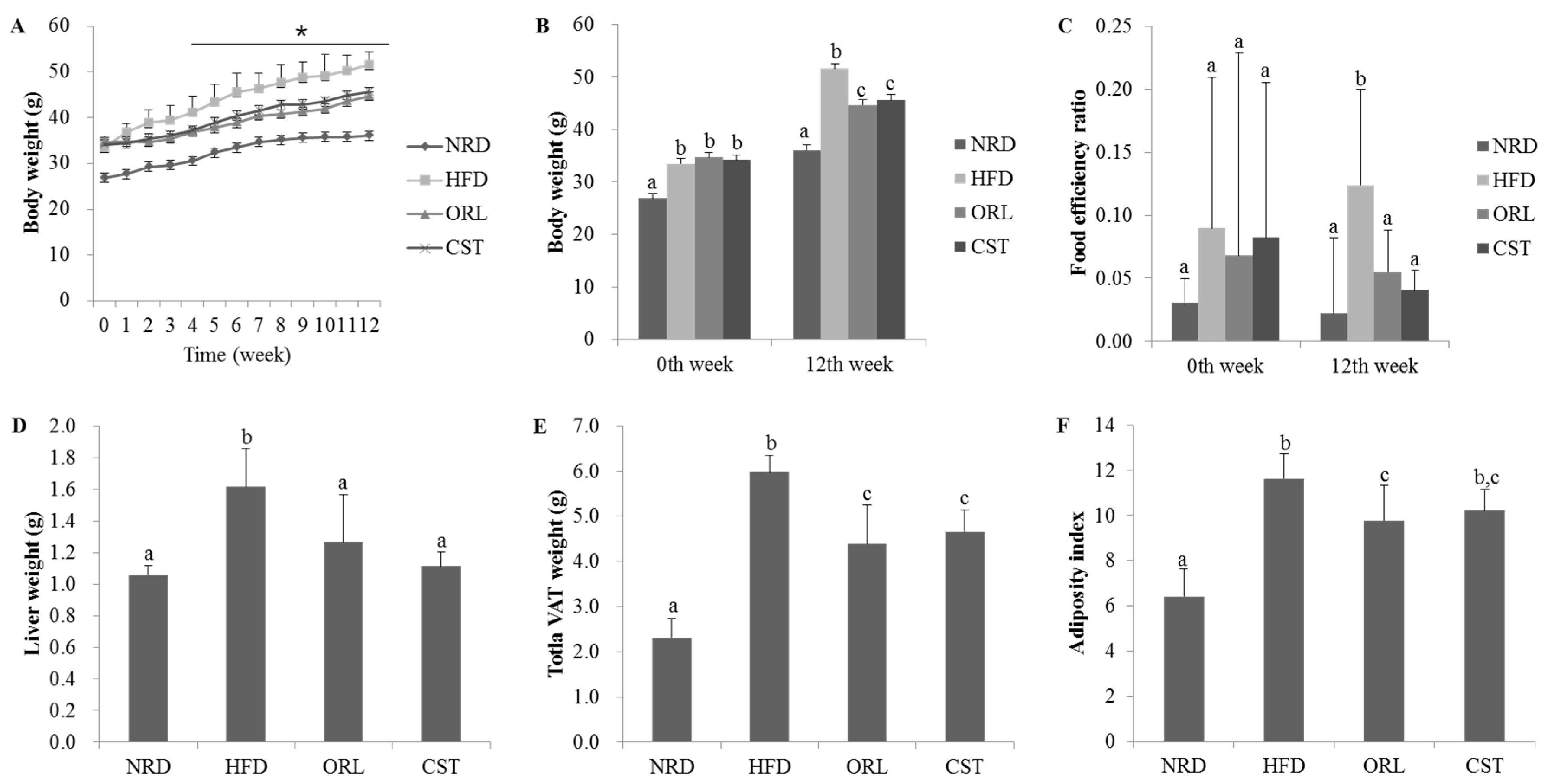 There were no significant differences in the initial (0th week) body weight among the HFD, ORL and CST groups. However, from the 3rd week onwards to 12th week, significant (p < 0.05) differences in the body weight were observed among the HFD, ORL and CST groups (Figure 1A). Notably, at 12th week, in addition to the body weight, liver weight, food efficiency ratio, weight of the total visceral adipose tissues (VAT; weight of adipose tissues of kidney, testis, and intestine in total), and visceral adiposity index of HFD-fed mice were found to significantly (p < 0.05) higher compared to those of NRD mice. However, all of these parameters significantly (p < 0.05) decreased in HFD-fed mice when treated with ORL. Except for the adiposity index, similar kinds of effects in HFD-fed mice were also shown by CST (Figure 1B–G).