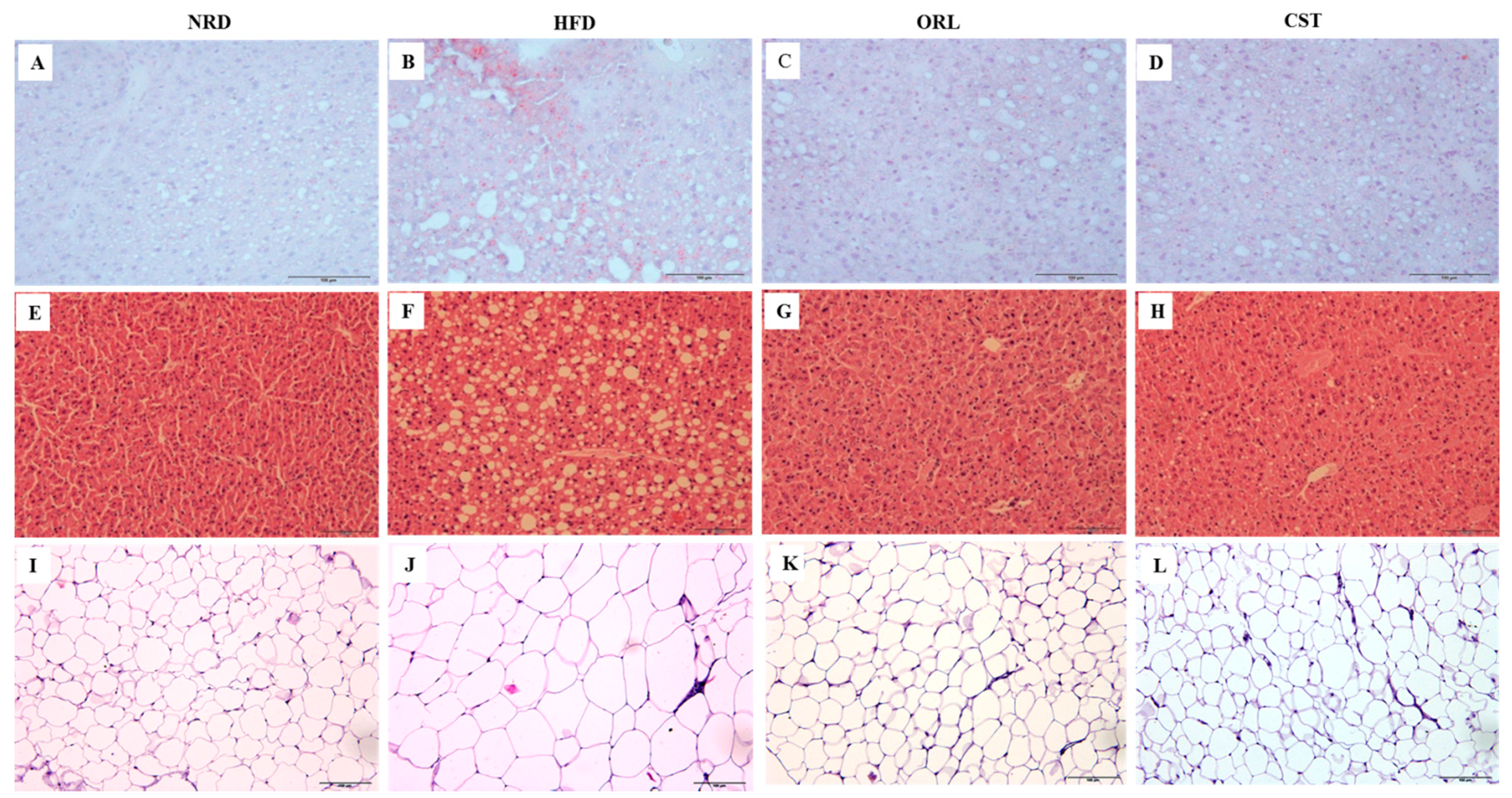 The histological analysis of frozen liver tissue sections stained with oil-O-red revealed minimal fat droplets in the hepatic tissues of NRD, but high abundance in HFD-fed mice (Figure 3A,B). However, a marked reduction in the hepatic lipid accumulation was observed in the HFD-fed mice in response to the treatment with ORL or CST (Figure 3C,D). Further, histological evaluation of hematoxylin and eosin-stained paraffin tissue sections of NRD mice revealed normal lobular architecture of the liver with negligible appearance of large vacuoles (Figure 3E). In contrast, the liver of HFD-fed mice exhibited an aberrant histological structure characterized by abundant large vacuoles indicating increased hepatosteatosis and ballooning (Figure 3F). However, minimal small vacuoles were observed in HFD-fed mice when exposed to ORL or CST (Figure 3G,H). Moreover, the histology of hematoxylin and eosin-stained paraffin sections of adipose tissues showed the appearance of small adipocytes in the NRD, but large in HFD-fed mice (Figure 3I,J). Similar to NRD mice, only small adipocytes were observed in the adipose tissues of HFD-fed mice in response to treatment with ORL or CST (Figure 3K,L).