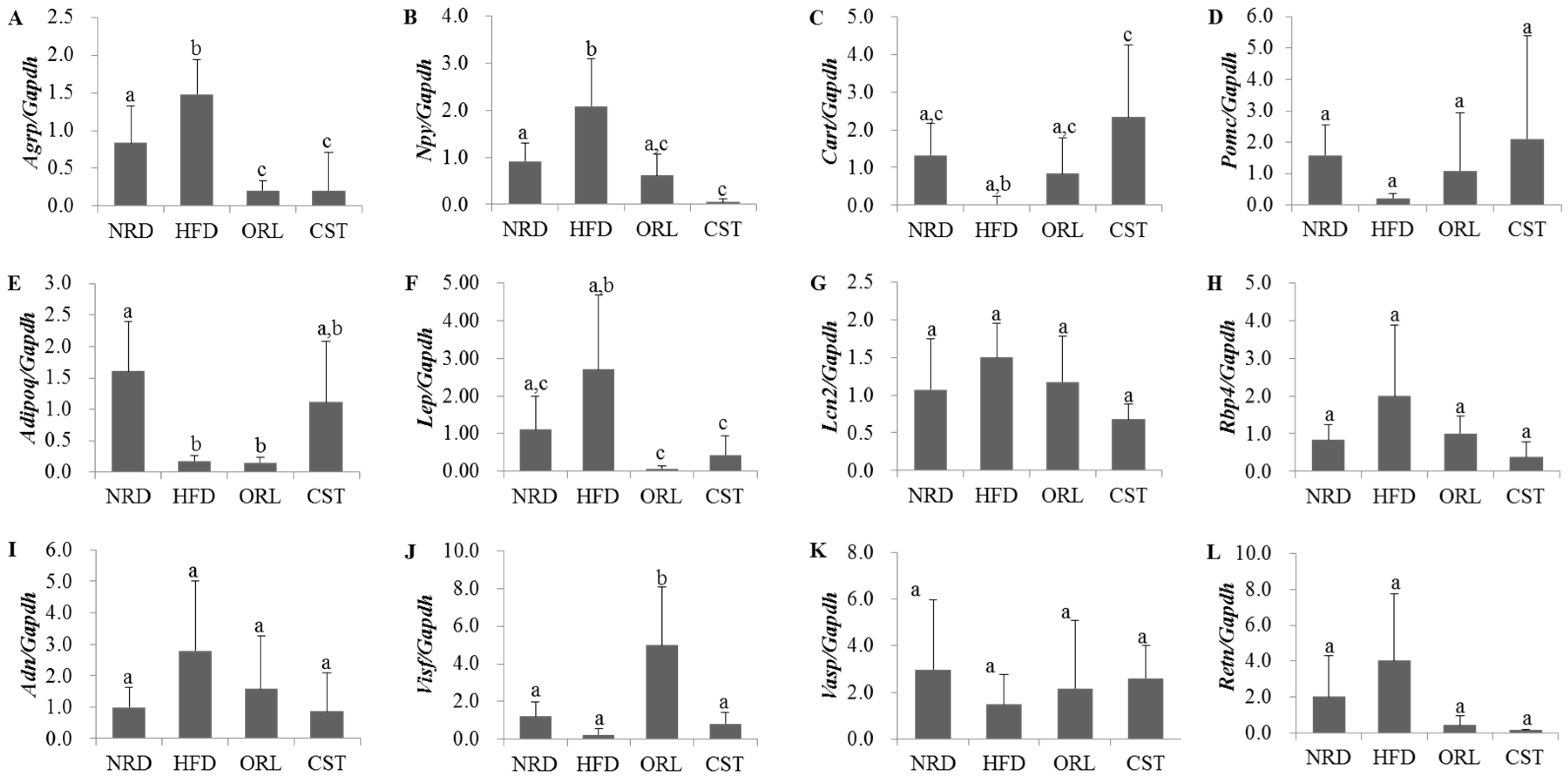 We examined the levels of expression of obesity-related neuropeptides in the hypothalamus and adipokines in adipose tissue using qRT-PCR. The expression of genes encoding obesity-promoting neuropeptides Agrp and Npy were significantly (p < 0.05) up-regulated in HFD-fed mice compared with NRD mice (Figure 4A,B). However, the expression of both of these genes in HFD-fed mice were significantly (p < 0.05) down-regulated when treated with either CST or ORL. In contrast, the mRNA level of the obesity-suppressing neuropeptide Cart in HFD-fed mice was lower than the NRD mice, although chance could not be ruled out (Figure 4C); it increased significantly (p < 0.05) when treated with CST, but not ORL. The gene expression of Pomc did not differ significantly between HFD-fed and NRD mice (Figure 4D), while the level of adipokine Adipoq mRNA was significantly down-regulated in HFD group vs. NRD group (Figure 4E). The levels of expression of both Pomc and Adipoq genes in HFD-fed mice did not change significantly when treated with either CST or ORL. The expression of Lep gene in the HFD group was higher versus the NRD group, although chance could not be ruled out, but reduced significantly when exposed to either ORL or CST (Figure 4F). The mRNA levels of Lipo2, Rbp4, Adn and Retn adipokines in HFD-fed mice were higher compared with NRD mice, and decreased when treated with either CST or ORL (Figure 4G–I,L), although chance could not be ruled out in either case. In contrast, the expressions of both Visf and Vasp in HFD-fed mice were lower than in NRD mice (Figure 4J,K), although chance could not be ruled out. The mRNA level of Vasp in HFD group increased when treated with either ORL or CST, although chance could not be ruled out. The expression of Visf in HFD-fed mice increased significantly and insignificantly when exposed to ORL but not when exposed to CST.