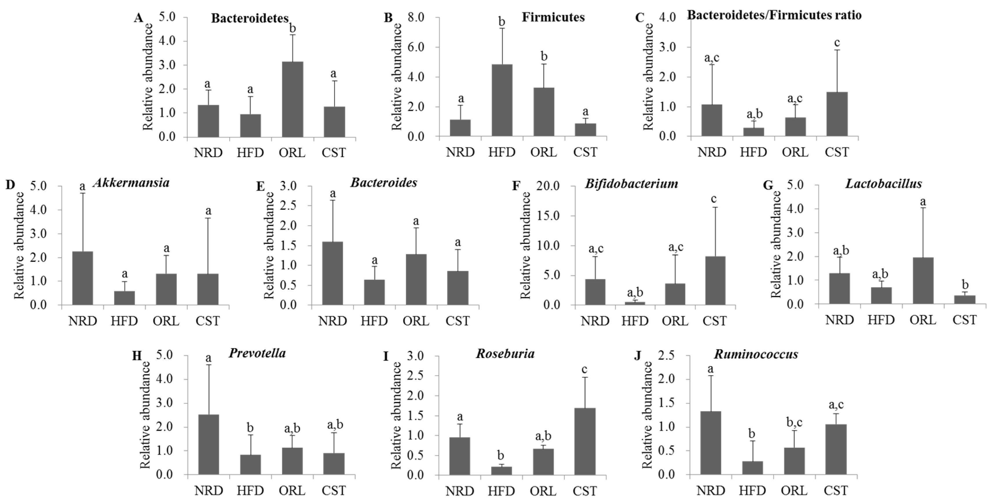 We quantified the RA of fecal microbiota of 12th-week samples at the phyla or genus levels using qRT-PCR. The exposure of HFD-fed mice to ORL resulted in significant (p < 0.05) increases in RA of Bacteroidetes, and CST exposure resulted in slight RA increase although chance could not be ruled out (Figure 5A). In contrast, RA of Firmicutes in HFD group was decreased significantly (p < 0.05) upon treatment with CST, but not ORL (Figure 5B). Accordingly, the ratio of Bacteroidetes/Firmicutes was significantly (p < 0.05) higher in CST-, but not ORL-treated HFD-fed mice compared with HFD-fed mice (Figure 5C). The RA of Akkermansia, Bacteroides, Lactobacillus and Prevotella did not differ significantly between the HFD-fed mice and HFD-fed mice treated with ORL or CST groups (Figure 5D,E,G,H). The RA of Bifidobacterium, Rosenburia and Ruminococcus were significantly (p < 0.05) elevated in HFD-fed mice when treated with CST, but not ORL (Figure 5F,I,J).