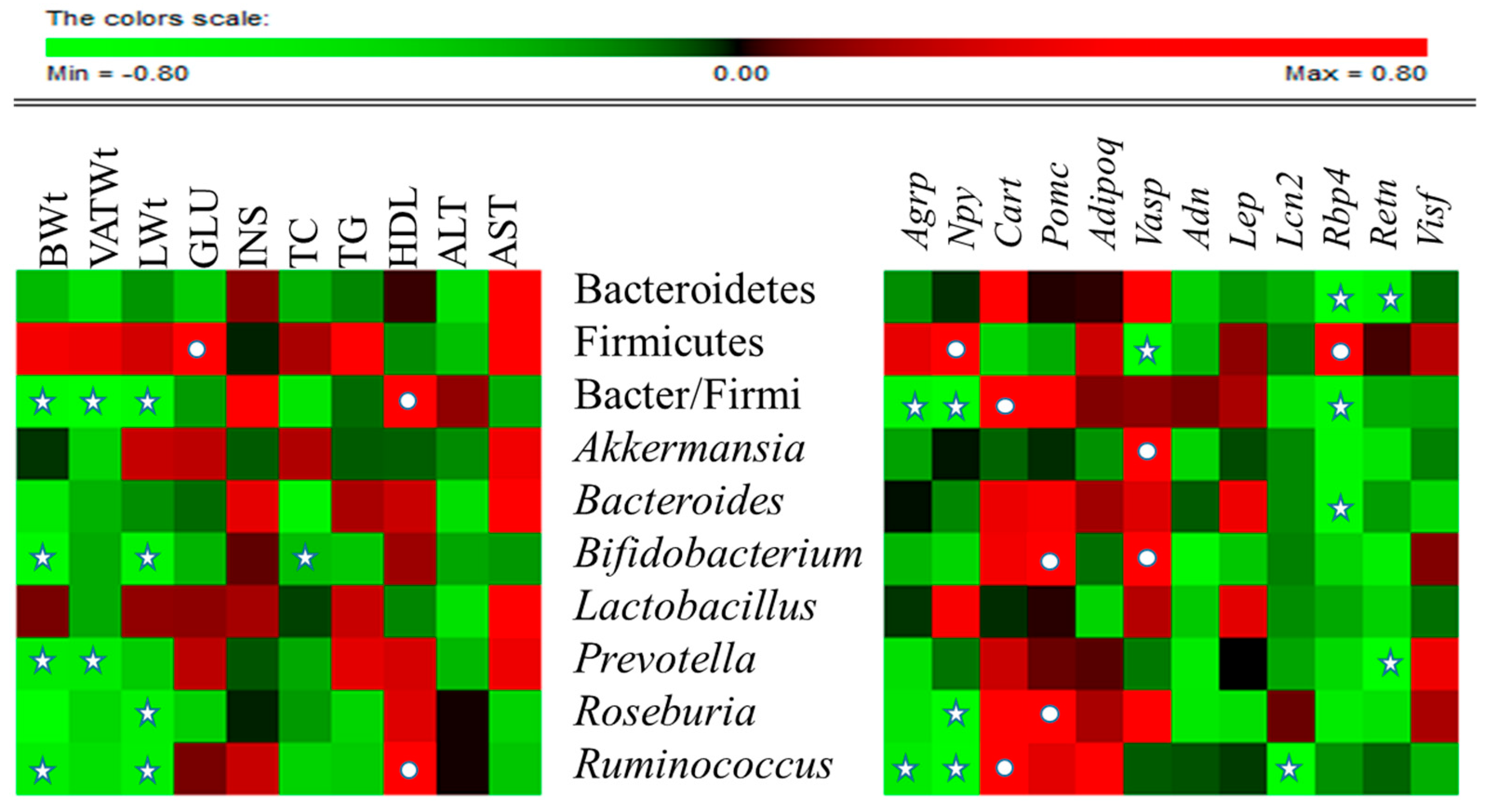 Correlation between gut microbial relative abundance and host metabolic parameters, neuropeptides and adipokines: Data of all experimental groups (except normal) were gathered and analyzed by SPSS software (17.0. version, Chicago, IL, USA) using Spearman’s rho calculated by Permut Matrix software (version 1.9.3 EN, Montpellier, France) for heatmap plots. As the colors scale shows, green color indicates a negative correlation, while red color denotes a positive correlation. The ★ symbol indicates statistically significant negative correlation (p < 0.05) and • symbol indicated statistically significant positive correlation (p < 0.05).