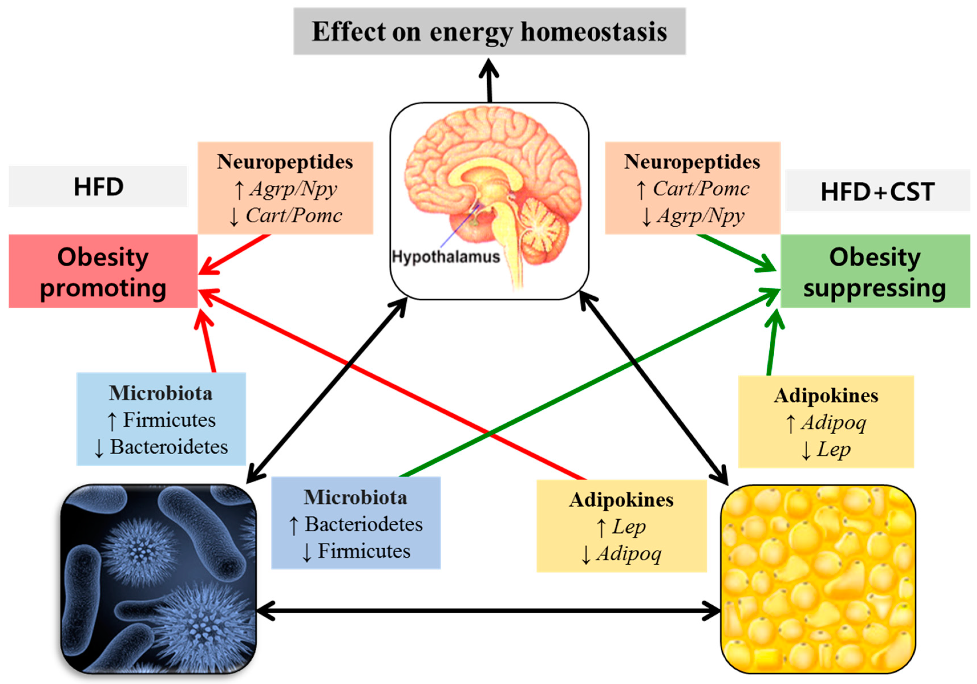 In conclusion, functional synchronization between the components in the axis of metabolic pathways is requisite to maintain the normal physiological processes. In case of brain-gut-adipose tissues axis, synchronization is achieved through interaction between and among the gut-secreted hormones or peptides, intestinal microbiota, adipose tissue-derived adipokines, and brain derived-neuropeptides. Our findings indicate that CST treatment exerts an anti-obesity effect on HDF-induced obesity. This beneficial impact of CST is mediated through the modulation of obesity-related neuropeptides and adipokines of the brain-gut-adipose tissues axis and the RA of gut microbial population. In particular, CST prevents the imbalance of gut microbiota and restores the RA of Bacteroidetes/Firmicutes ratio in HFD-fed mice. It can be concluded that CST has potential anti-obesity effect that may work by suppression of obesity-promoting and induction of obesity-suppressing neuropeptides and adipokines that could modulate the RA of gut microbiota.