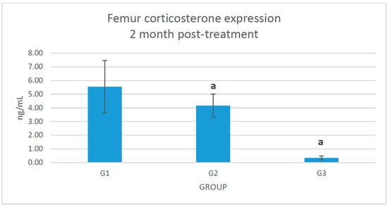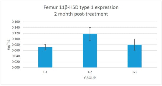 The metaphyseal area of the femoral heads were homogenized with metal beads in 2 mL microtubes. The phosphate buffered saline (PBS) with a pH of 7.4 was used as a homogenizing solution. The samples were centrifuged at 5000 rpm for 5 min at 4 °C. The supernatants were analysed using the sandwich-type ELISA kit for rats (Rattus norvegicus) from USCN Life Science Inc. (Wuhan, China) for detection of 11β-HSD type 1 protein expression. The samples were added to microtiter plates which were pre-coated with an antibody specific to the 11β-HSD type 1. A biotin-conjugated antibody preparation specific for 11β-HSD type 1 was added. Next, avidin conjugated to horseradish peroxidase (HRP) was added and incubated. After adding tetramethylbenzidine (TMB) substrate solution, only samples that contained 11β-HSD type 1, biotin-conjugated antibody, and enzyme-conjugated avidin exhibited colour change. These enzyme–substrate reactions were terminated by sulphuric acid solution, and the colour changes were measured spectrophotometrically at 450 nm wavelength. The serum was prepared for analysis of corticosterone and 11-dehydrocorticosterone concentration level [] by using ELISA kits from MyBioSource, Inc. (California, CA, USA). Blood serum (2 mL) was taken through the retro-orbital sinus. After 20 min at room temperature, the serum was centrifuged at 3000 rpm for 20 min. The supernatant was taken for measurement of the corticosterone and 11-dehydrocorticosterone concentration levels using indirect method of ELISA. The intra-assay and inter-assay coefficient of variations (CV) for 11β-HSD type 1 and corticosterone ELISA kits were <10% and <12%, respectively. The intra-assay and inter-assay CVs for 11-dehydrocorticosterone were <15%. No significant cross-reactivity or interference were observed between corticosterone, 11-dehydrocorticosterone, and 11β-hydroxysteroid dehydrogenase type 1, with their analogues.