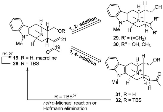 In a synthetic sense, sarpagine alkaloids could originate from a Michael-type reaction of the N(4) nitrogen atom of macroline 19 onto the α,β-unsaturated carbonyl system at C-21 either by a 1,2 or a 1,4-type addition reaction, as illustrated in Figure 4 [54,56]. On the other hand, the sarpagine 32 can be converted into macroline 19 by a retro-Michael process, reported in a biomimetic sense originally by LeQuesne et al. [57].