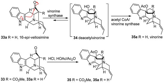 The biogenetic relationship between these series of alkaloids has been reported previously [58,59,60,61]. Stӧckigt et al. converted 16-epi-vellosimine 33a into vinorine 35a via deacetylvinorine 34 using acetyl CoA dependent vinorine synthase [62,63,64]. This study confirmed the conversion of the endo-aldehyde containing sarpagine skeleton (33) into the ajmaline skeleton (35) under acidic conditions, as suggested earlier by Woodward (Figure 5) [58].