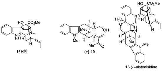 Structures of (+)-quebachidine (20), (+)-macroline (19), and (−)-alstonisidine (13).