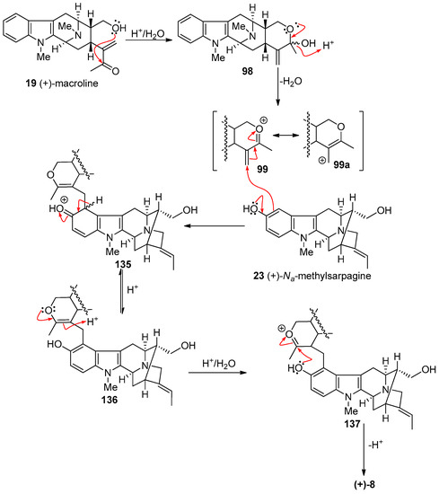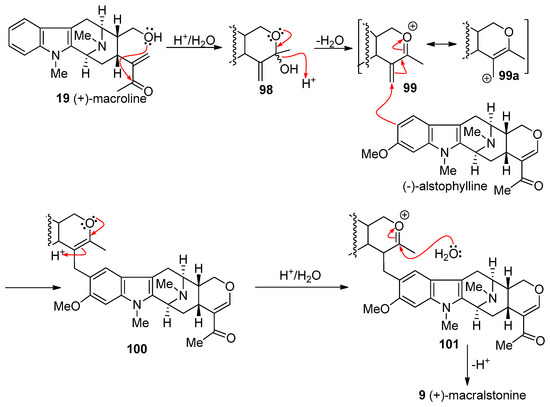 At least two mechanisms are possible for the formation of macralstonine 9 by the acid catalyzed coupling of macroline and the ring-A oxygenated macroline-type indole base (−)-alstophylline 22. One possible mechanism was the earlier described Michael process [135]; however another potential mechanism is a Friedel-Crafts alkylation process stabilized by the oxonium ion [136]. The Michael addition followed by cyclization is straight-forward, as shown in Scheme 10. The electron-rich aromatic ring adds nucleophiliclly in a 1,4-fashion to form the alkylated product ortho to the methoxy group, followed by nucleophilic addition of the C-17 hydroxy group to the carbonyl carbon atom to form the cyclic hemiketal present in macralstonine 9. On the other hand, alternatively, acid catalyzed intra-molecular cyclization of (+)-macroline, which involves the nucleophilic attack of the C-17 hydroxyl group on to the carbonyl carbon atom (1,2-fashion) would provide the cyclic hemiketal 98. This intermediate can then lose a molecule of water to form the oxonium ion species 99 (Figure 8). Electrophilic attack of the electron rich aromatic ring onto the oxonium ion electrophile would furnish the cyclic enol-ether 100, as suggested by Fukuyama. The cyclic enol-ether would then isomerize to an oxonium ion, only to be attacked by water to provide the cyclic hemiketal present in macralstonine 9.