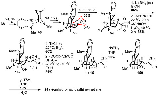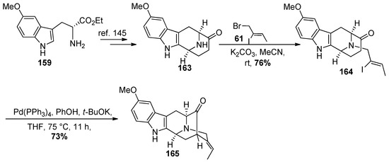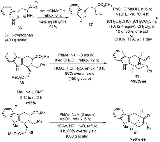 The Nb-benzylation was done on amine 37 with benzaldehyde in methanol at room temperature, followed by reduction of the so formed iminium ion salt with sodium borohydride added slowly to the mixture at −10 °C. Subsequently, trifluoroacectic acid was added to the mixture at 0 °C to bring the pH to 7. After removal of the solvent, methylene chloride, trifluoroacetic acid (TFA) and 4,4-dimethoxybutyrate were added to the mixture at 0 °C and this was stirred for 10 days at room temperature to yield the trans-diester 38 in 83% yield as the sole product [70]. This could be accomplished in refluxing chloroform in one day in slightly lower yield. Next, the Dieckmann cyclization was done in the presence of a large excess of NaOMe and methanol in toluene at reflux for 72 h (6 h for the Na-Me indole) to yield the cyclized product. At the completion of the reaction, the reaction mixture was cooled to 0 °C and the excess base was neutralized with glacial acetic acid and the solvent was removed under reduced pressure. After that, glacial acetic acid and aqueous hydrochloric acid as well as water were added to the mixture and it was allowed to reflux under these strongly acidic conditions to furnish the product of decarboxylation. This gave Nb-benzyl tetracyclic ketone 39, in 80% overall yield on large scale. For the Na-Me series, the trans-diester 38 was methylated using iodomethane and sodium hydride in DMF to yield the Na-Me trans-diester 40 in >95% yield, which under the same conditions as 38 gave the Na-Me tetracyclic ketone 41 in a one-pot process. This route is still one of the best routes since reactions can be done on multi-hundred gram scales and do not require protection of the Na-H function. This is an enantioselective and regioselective process in >98% ee. This route with two one pot conversions also requires fewer steps than previous routes [69,70,71]. In addition, the availability of d-(+)-tryptophan and the (−)-enantiomer provides a route to both enantiomers of the alkaloids including the ability to condense mismatched pairs, as mentioned.
