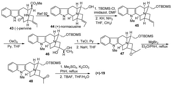 The earliest synthesis of (+)-macroline 19, a biomimetic synthesis, was done by LeQuesne et al. in 1980 [57] and the absolute configuration had been confirmed by X-ray crystallography by Hesse in 1981 [91]. In this synthesis, LeQuesne et al. converted (−)-perivine 43 to (+)-normacusine 44, according to the reported procedure by Gorman et al. (Scheme 3) [92]. The protection of the hydroxyl group (in 44) as the tert-butyldimethylsilyl ether, was followed by Na-methylation to furnish the sarpagine system 45. Osmylation of olefin 45 with OsO4 and pyridine in THF gave an inseparable mixture which contained the diol 46, along with a related spirooxindole byproduct. The bulky TBDMS function rendered the osmylation sequence stereoselective, although marred by the formation of the spirooxindole side-product. This mixture was treated with TsCl and Py, followed by NaH in THF to give the epoxide 47 that could be purified by crystallization. The epoxide underwent rearrangement on treatment with freshly prepared MgBr2 to furnish the ketone 48. The methylation of the Nb function was performed with dimethyl sulfate and potassium carbonate, in refluxing benzene. This was followed by the retro-Michael reaction in base followed by desilylation with TBAF to provide (+)-macroline 19 [57].
