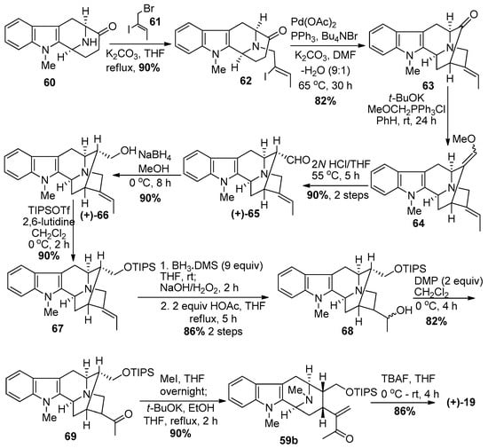 In another more recent and improved approach (Scheme 5) [87,88], Nb-alkylation via SN2 substitution on (Z)-1-bromo-2-iodo-2-butene 61 in the presence of K2CO3 in refluxing THF gave the vinyl iodide 62. The palladium catalyzed intramolecular cyclization of the enolate anion with the vinyl iodide took place in a stereospecific manner to yield the pentacyclic ketone 63. A one-carbon homologation via Wittig olefination with methoxymethyl triphenylphosphonium chloride with potassium tert-butoxide in benzene, followed by hydrolysis of the so formed enol ether 64 in aqueous HCl/THF furnished the α-aldehyde 65 ((+)-Na-methylvellosimine; an alkaloid isolated from Alstonia nitida [98]). The aldehyde was reduced with sodium borohydride to provide (+)-affinisine 66, another alkaloid obtained from A. macrophylla [99]. The protection of the primary alcohol as the TIPS ether with triisopropylsilyl triflate and 2,6-lutidine gave indole 67. The hydroboration-oxidation of the olefin in 67 went smoothly to provide the secondary alcohol 68 in very good yield, accompanied by a small amount of the corresponding tertiary alcohol. An equivalent of BH3 is known to complex with the Nb-nitrogen function which alters the electronic character in the vicinity of the olefin, which presumably resulted in the formation of the small amount of tertiary alcohol. The Dess-Martin periodinane-mediated oxidation of the alcohol 68 to the ketone 69 took place in high yield. The quaternization of the Nb-nitrogen with methyl iodide in THF at 0 °C, was followed by treatment of the so formed Nb-methiodide salt with potassium tert-butoxide in ethanol under modified conditions to provide the stable macroline equivalent 59b. Again, this intermediate can be easily stored. The de-silylation with tetrabutylammonium fluoride resulted in the synthesis of (+)-macroline 19 identical to that obtained above in much higher overall yield and fewer steps. These reactions could be scaled up with ease as well.